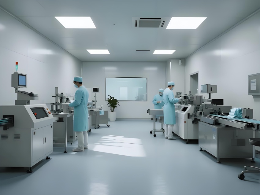 本潔凈車間設計采用現(xiàn)代工業(yè)極簡風格,強調功能性與潔凈度。主色調選用淺灰藍(墻面)與純白(頂面)的搭配,營造冷靜專業(yè)的氛圍,局部用淡綠色做視覺緩沖。