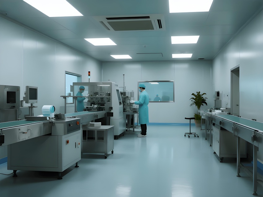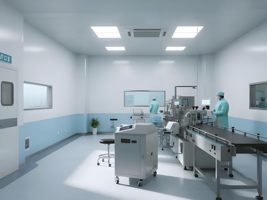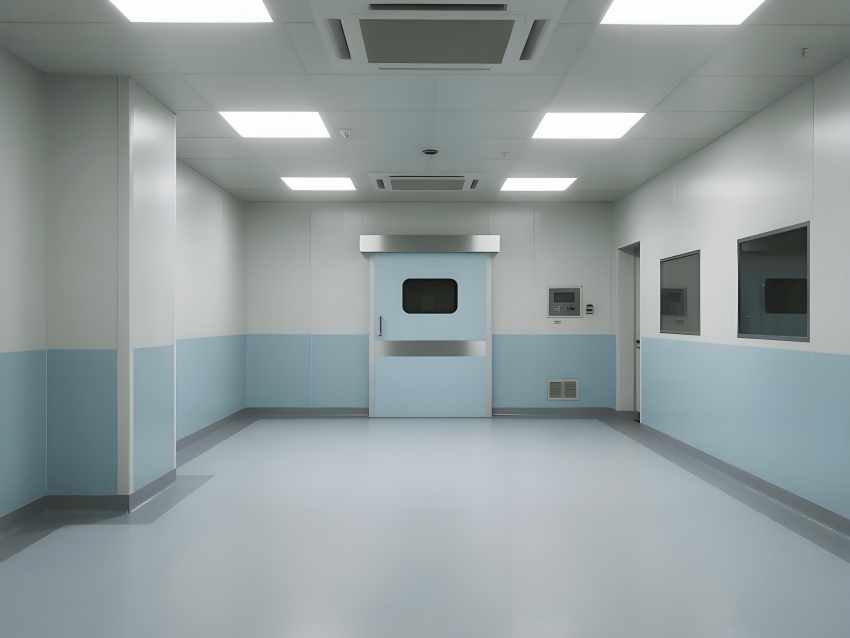 地面采用防靜電環(huán)氧自流平,耐磨無縫隙且易清潔;墻面為50mm厚抗菌彩鋼板,圓弧角處理避免積塵;頂面配置一體化鋁扣板吊頂,內置FFU空氣過濾單元,與LED平板燈形成均勻照明。