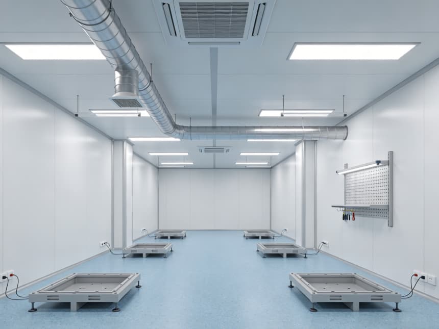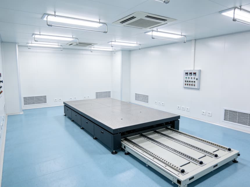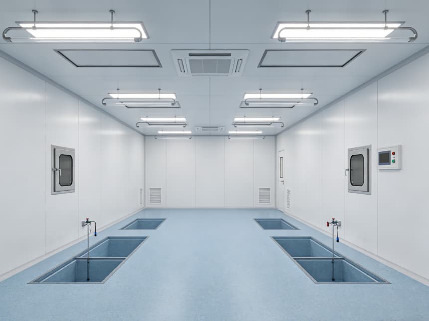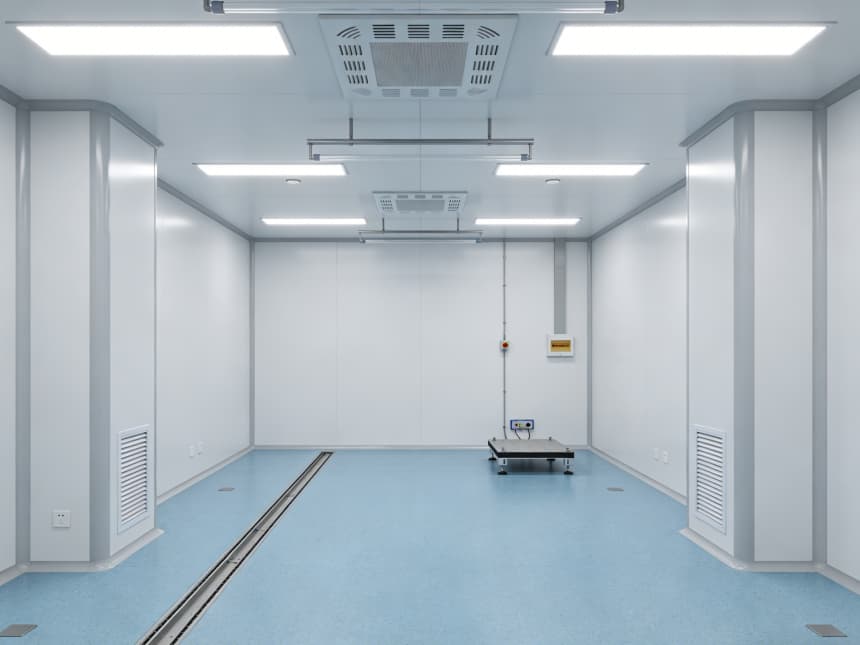 電子光學(xué)車間內(nèi)部細(xì)節(jié)設(shè)計(jì)精準(zhǔn)匹配行業(yè)核心需求,整體采用淺藍(lán)色防靜電潔凈地坪與白色無(wú)縫潔凈墻面的組合,風(fēng)格簡(jiǎn)約統(tǒng)一。地面選用3mm厚環(huán)氧防靜電材質(zhì),表面經(jīng)啞光工藝處理,既能有效規(guī)避強(qiáng)光反射對(duì)光學(xué)檢測(cè)造成的干擾,又具備10?-10?Ω的穩(wěn)定防靜電性能;同時(shí)兼具優(yōu)異的耐磨特性,可耐受酒精等常用清潔劑擦拭,墻角均采用50mm圓弧設(shè)計(jì),從根源上消除積塵死角,筑牢潔凈基礎(chǔ)。