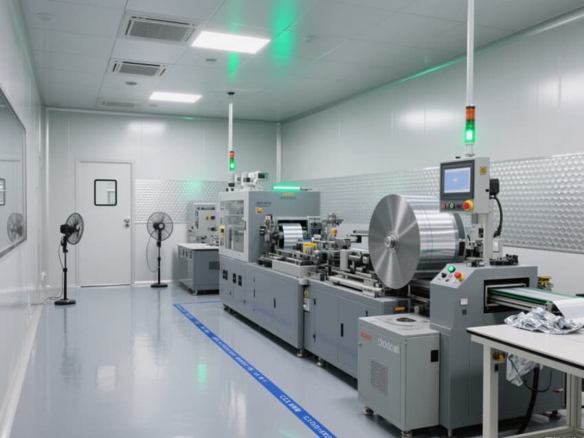 車間以銀灰色抗菌金屬彩鋼板搭建墻體與吊頂,搭配淺灰色防靜電環(huán)氧地坪,金屬質(zhì)感的建材兼具抗電解液腐蝕、易清潔特性,地面藍(lán)色防靜電標(biāo)識線清晰劃分涂布、卷繞、裝配等工序區(qū)域。頂部高效過濾器與定向?qū)恿飨到y(tǒng),實現(xiàn)每小時18-22次空氣置換,配合除濕機(jī)組將濕度精準(zhǔn)控制在20-30%RH,避免水分影響電芯性能。?