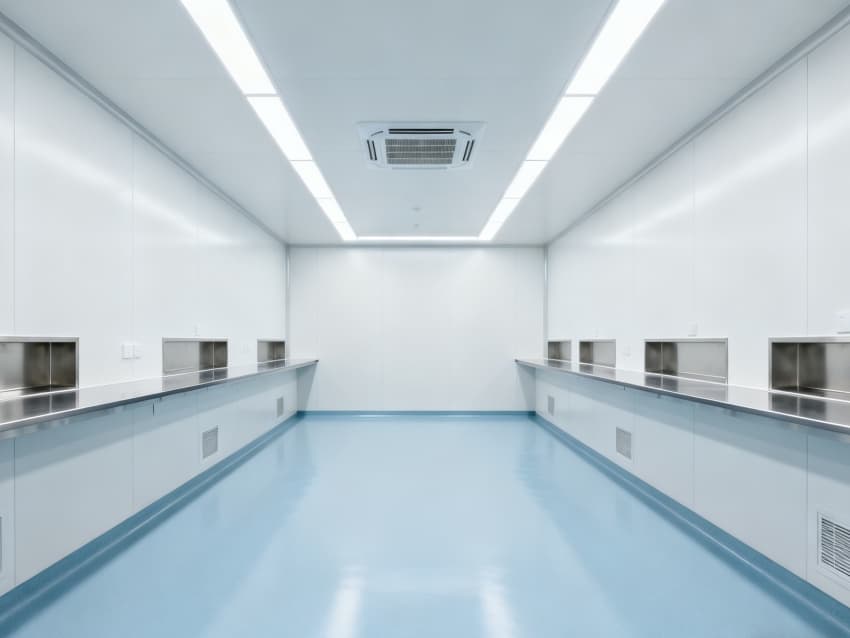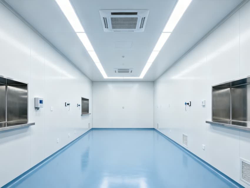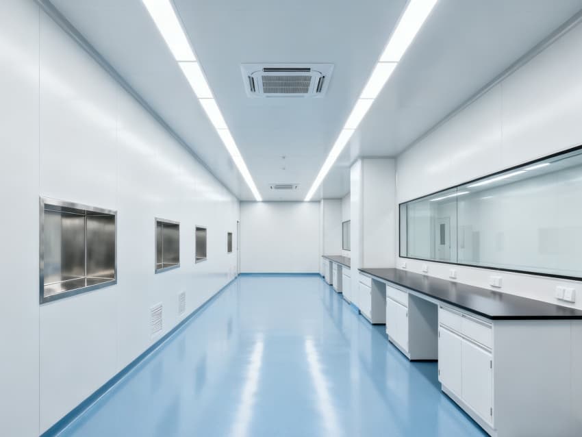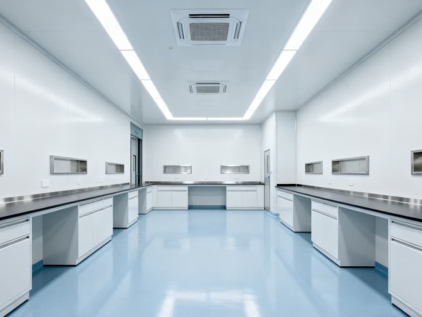 內(nèi)部6個(gè)實(shí)驗(yàn)室均為無(wú)設(shè)備空曠布局,按萬(wàn)級(jí)潔凈標(biāo)準(zhǔn)建設(shè):地面鋪設(shè)無(wú)縫抗菌環(huán)氧自流平,墻面采用食品級(jí)不銹鋼潔凈墻板,陰陽(yáng)角做R40圓弧處理杜絕積塵死角;柱網(wǎng)間距設(shè)為7.5米,預(yù)留實(shí)驗(yàn)臺(tái)、精密檢測(cè)設(shè)備安裝點(diǎn)位及運(yùn)維通道;頂部整合高效新風(fēng)過(guò)濾系統(tǒng)、恒溫恒濕裝置與防眩光LED照明,所有管線暗藏于吊頂內(nèi),最大化釋放空間高度與視野;實(shí)驗(yàn)室間通過(guò)通透玻璃隔斷銜接,進(jìn)一步強(qiáng)化整體空曠感,為藥物合成、質(zhì)量檢測(cè)等核心研發(fā)環(huán)節(jié)提供安全、潔凈的專(zhuān)屬環(huán)境。
