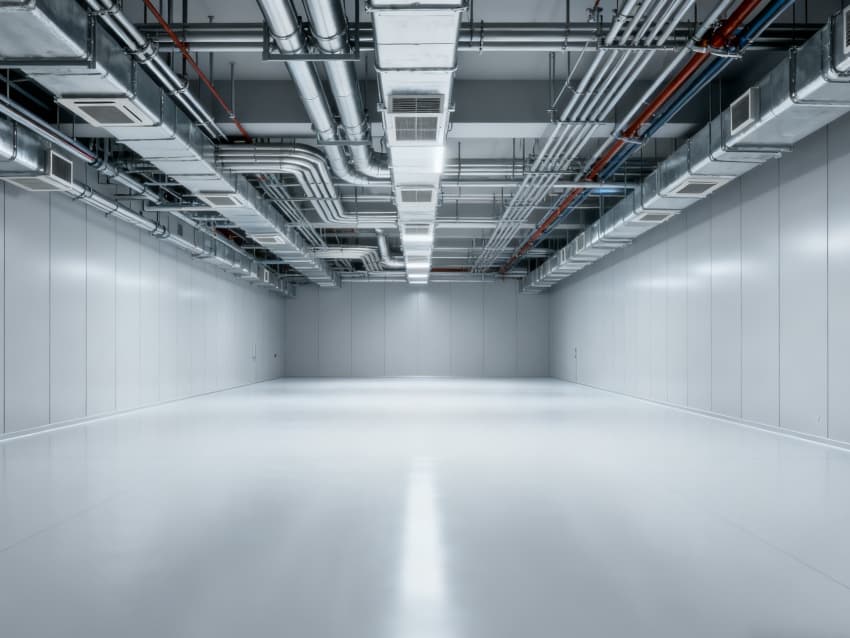 內部按功能劃分為六大核心區域:潔凈生產區采用無設備空曠布局,預留8-12米柱距滿足光刻機、刻蝕機等大型設備安裝需求;管線集成區通過規整的頂部管線橋架系統,實現水、電、氣、真空系統集中管控,減少管線交叉干擾;潔凈緩沖區設置于生產區入口,搭配墻面通風口保障潔凈度過渡;設備預留區保留開闊橫向空間,支持后期工藝動線調整;結構輔助區通過角落加固設計,滿足重型設備承重需求;墻面潔凈區采用光滑防污材質,降低粉塵附著率。整體空間兼顧半導體生產的潔凈標準與功能靈活性,適配合肥半導體產業發展需求。