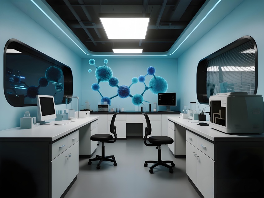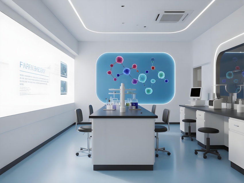 本設計以"科技賦能生命"為核心理念,構建純凈高效的研發環境。主體采用冰川白與醫用藍的漸變配色,墻面嵌入動態生物分子結構LED裝飾,營造科研儀式感。實驗區采用模塊化懸浮工作臺,透明智能玻璃隔斷實現空間通透性與功能分區的完美平衡。頂棚的流線型送風系統與地面熒光導視帶形成立體動線指引。核心無菌區采用圓形穹頂設計,搭配全息投影滅菌提示界面。數據分析中心配備曲面智能白板墻,實時可視化研究數據。危化品存儲區通過紅色光暈警示與物理隔離確保安全。整體空間融合醫療級潔凈美學與科幻實驗室語言,在嚴謹中注入未來感,通過智能交互界面與人性化燈光系統,打造國際一流水準的醫藥研發矩陣空間。