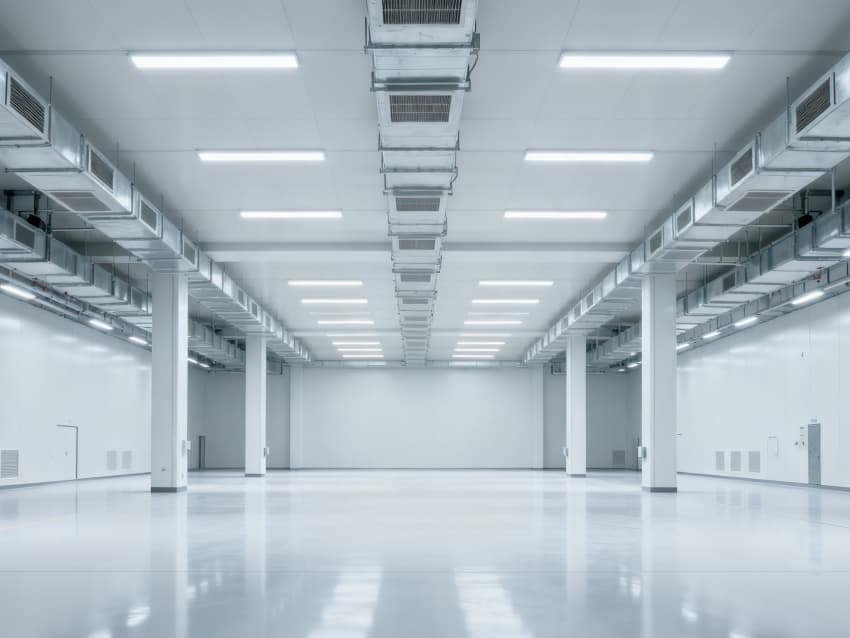 內部6個生產車間均為無設備空曠布局,按工業(yè)級潔凈與承重標準建設:地面鋪設耐磨防靜電環(huán)氧地坪,墻面采用白色環(huán)保潔凈墻板,陰陽角做圓弧處理減少積塵;柱網間距達10米,預留設備安裝與物流通道空間;頂部整合恒溫恒濕新風系統(tǒng)與節(jié)能LED照明,管線暗藏于吊頂內,避免空間雜亂;車間之間通過通透玻璃隔斷銜接,進一步強化整體空曠感,為新能源產品規(guī)模化生產、柔性產線調整提供高效、潔凈的空間支撐。