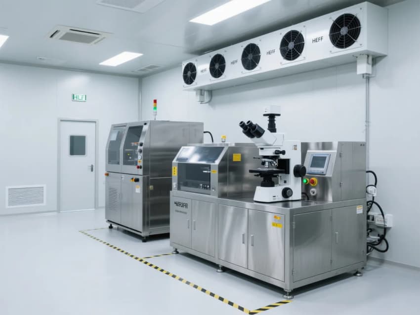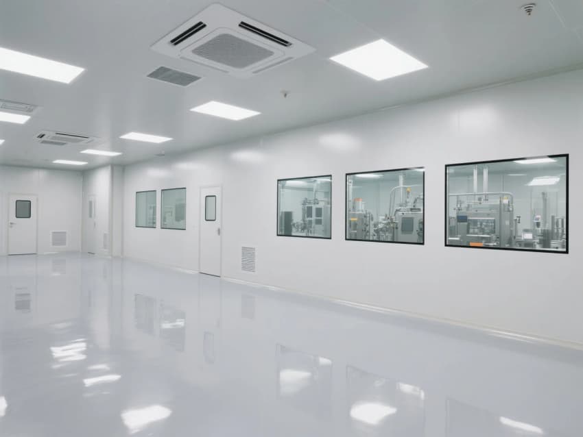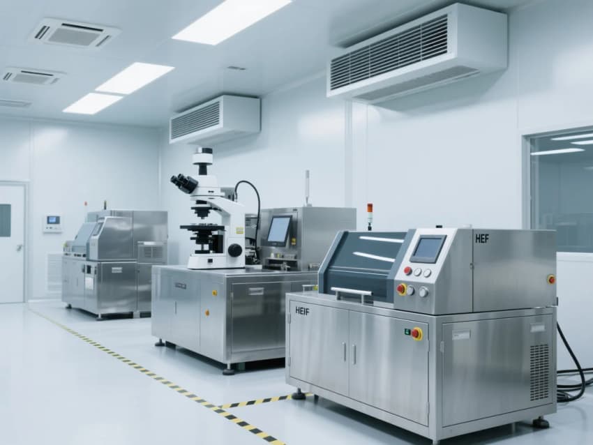 天花采用模塊化FFU(風(fēng)機(jī)過濾單元)系統(tǒng),配合高效HEPA過濾器,維持穩(wěn)定的氣流組織與潔凈度。設(shè)備區(qū)采用淺灰色不銹鋼圍擋,與白色潔凈墻面形成視覺區(qū)分,同時(shí)便于日常清潔維護(hù)。嵌入式LED無影燈帶提供均勻照明,減少作業(yè)陰影。整體設(shè)計(jì)強(qiáng)調(diào)功能性、安全性與可持續(xù)性,滿足電子光學(xué)制造的高標(biāo)準(zhǔn)環(huán)境需求。