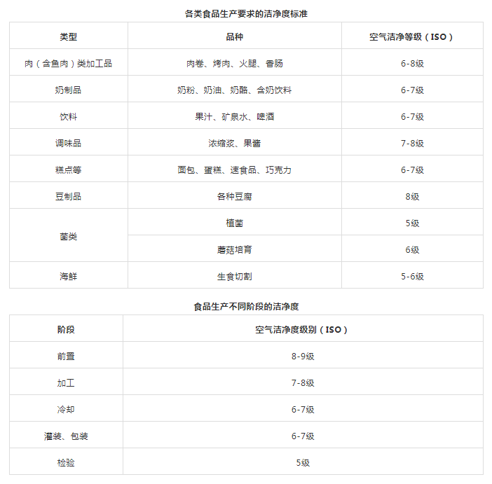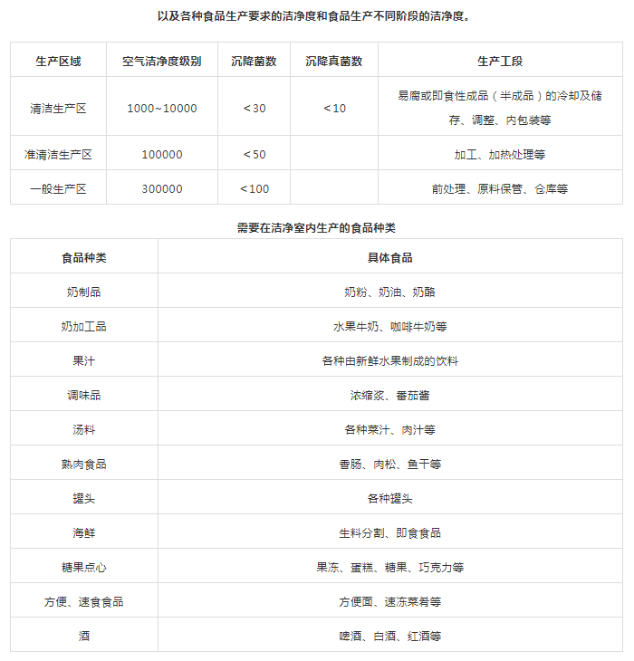 3、清潔作業(yè)區(qū)(潔凈室):指衛(wèi)生環(huán)境要求最高,人員、環(huán)境要求較高,必須經(jīng)過消毒和更衣才可以進(jìn)入,如:原料、成品裸露的處理區(qū)域,食食品的冷加工間、即食食品的冷卻間、待包裝即食食品的儲存間、即食食品的內(nèi)包裝間等。食品廠不同生產(chǎn)區(qū)域和空氣潔凈度等級