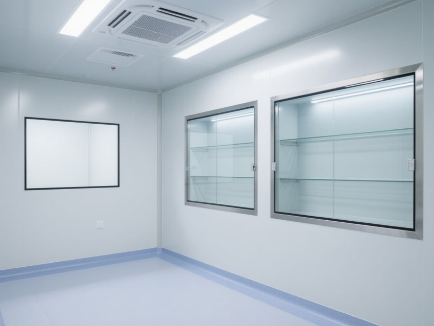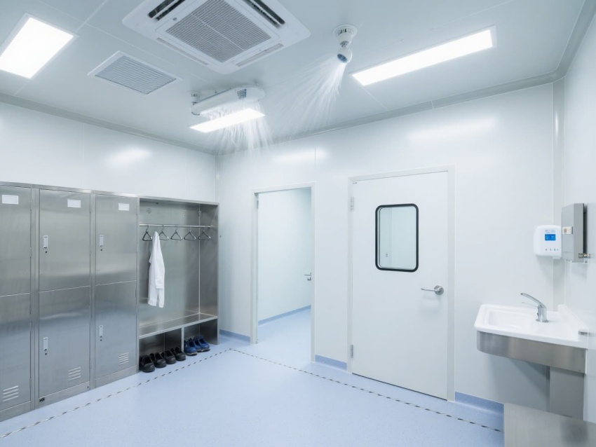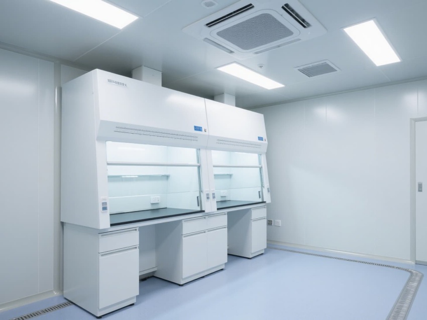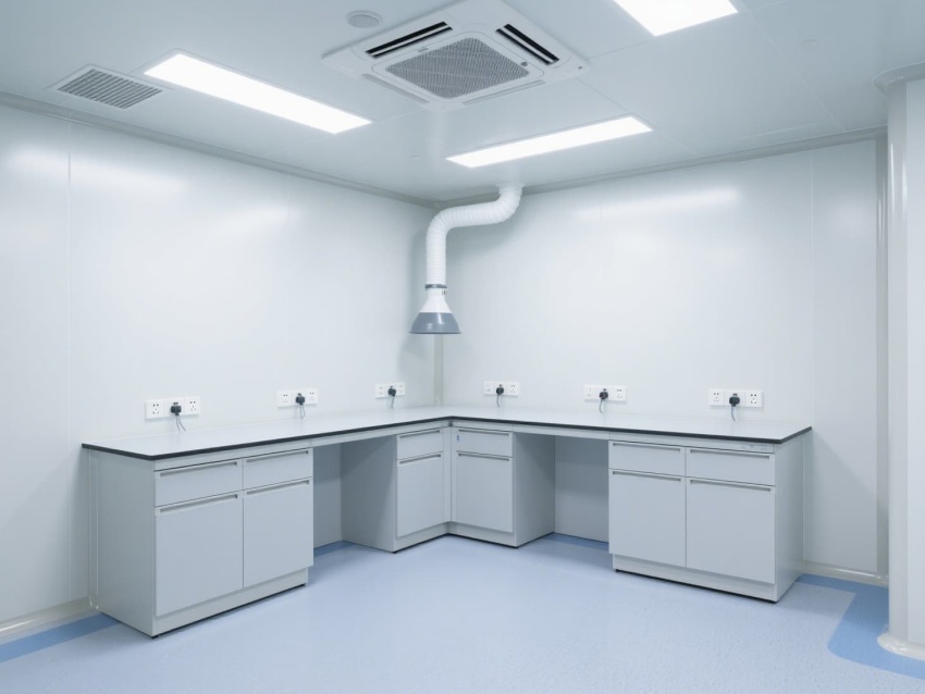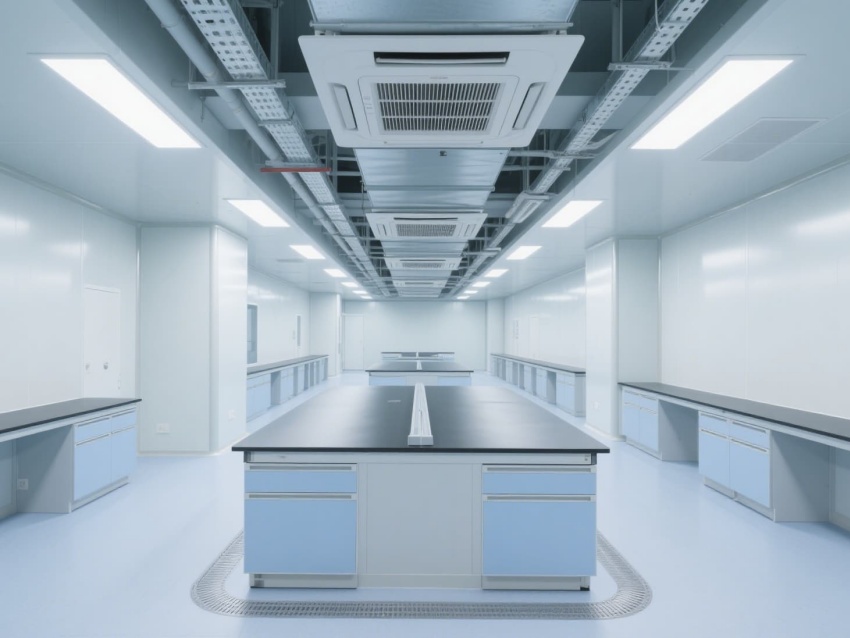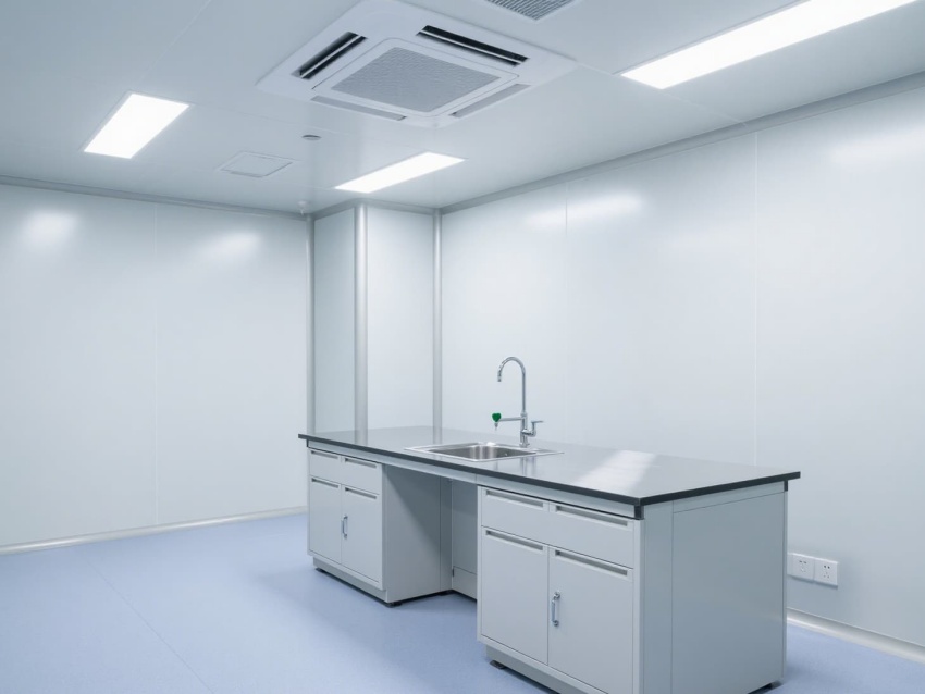 實(shí)驗(yàn)室以白色抗菌彩鋼板構(gòu)建墻體與吊頂,搭配淺藍(lán)灰色防靜電環(huán)氧地坪,整體色調(diào)簡(jiǎn)潔明快。墻面與地面的圓弧角設(shè)計(jì)避免積塵,便于高頻次消毒清潔。頂部高效過濾器形成單向流氣流,每小時(shí)15-20次空氣置換,維持室內(nèi)正壓以防外界污染。?